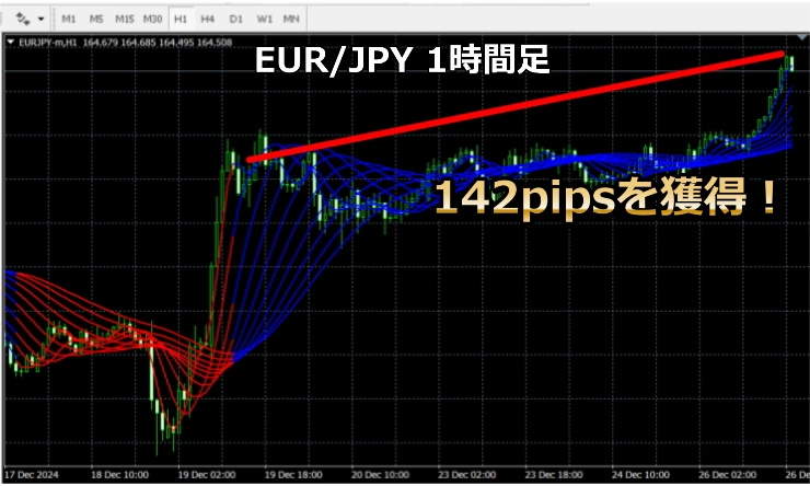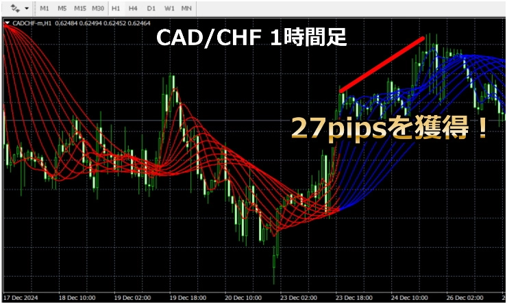 青い線の時は買いトレンド、赤い線の時は売りのトレンドで大きく上昇、下降しています。