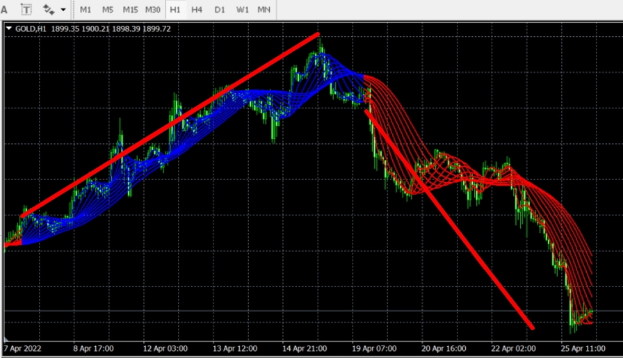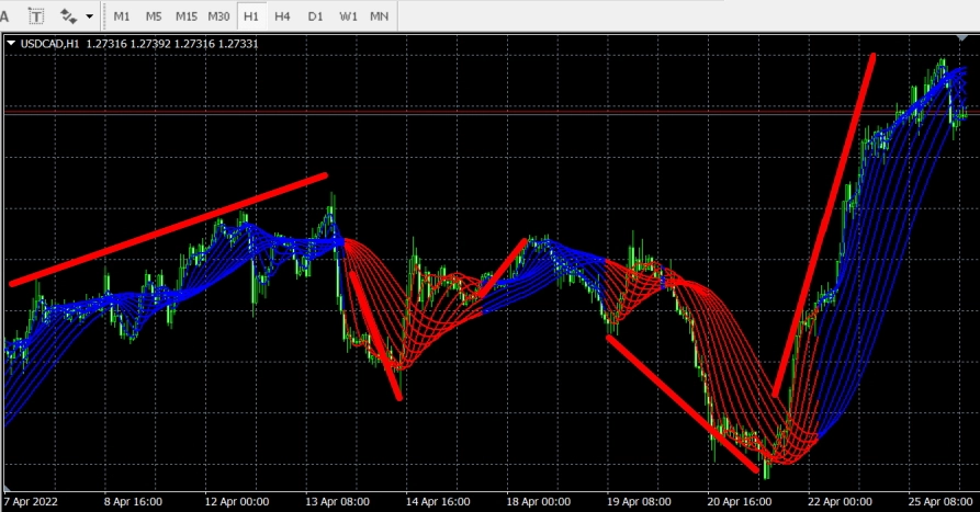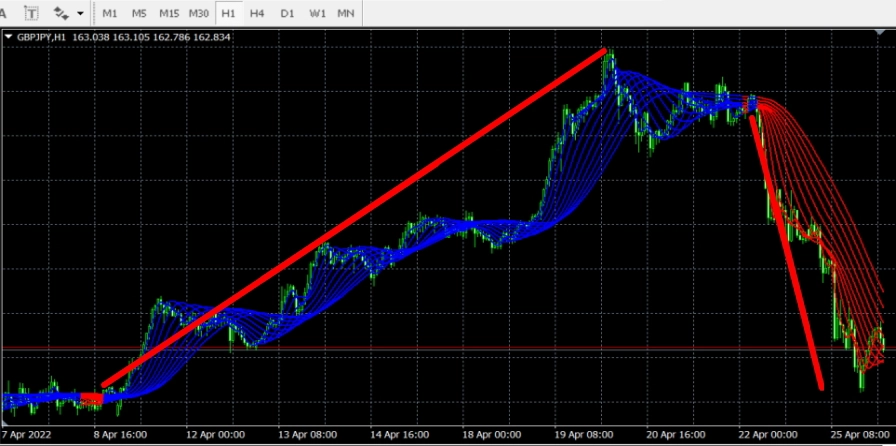 - 売りのトレンド:赤い線の時は売りのトレンド