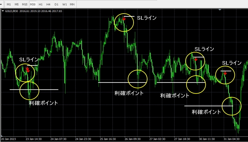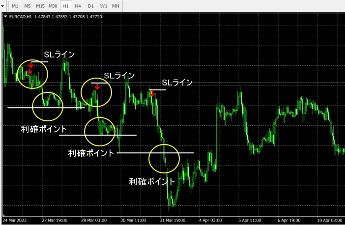 SLラインは矢印のすぐ上に置いて、利確は矢印の少し前の安値でしてください。少し前の安値がない場合は、SLの幅の2倍以上の幅を利確ポイントにしてください。