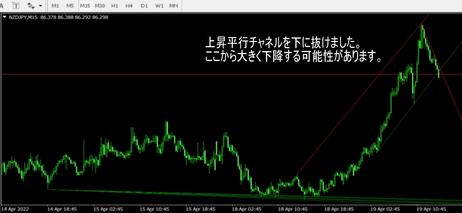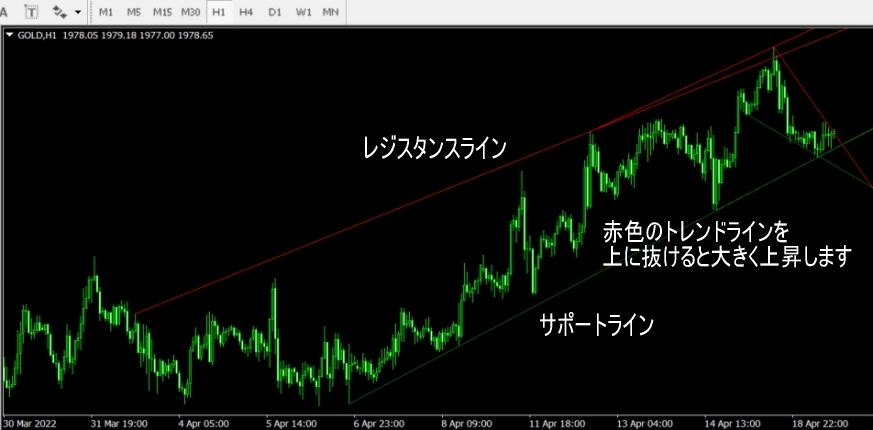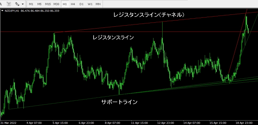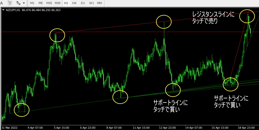 - 綺麗にレジスタンスラインとサポートラインが表示されている時、レジスタンスラインで売り、サポートラインで買いましょう。