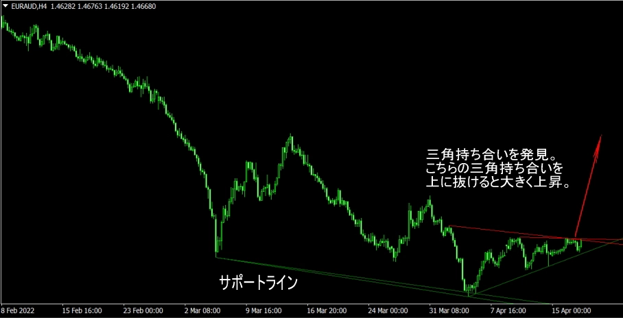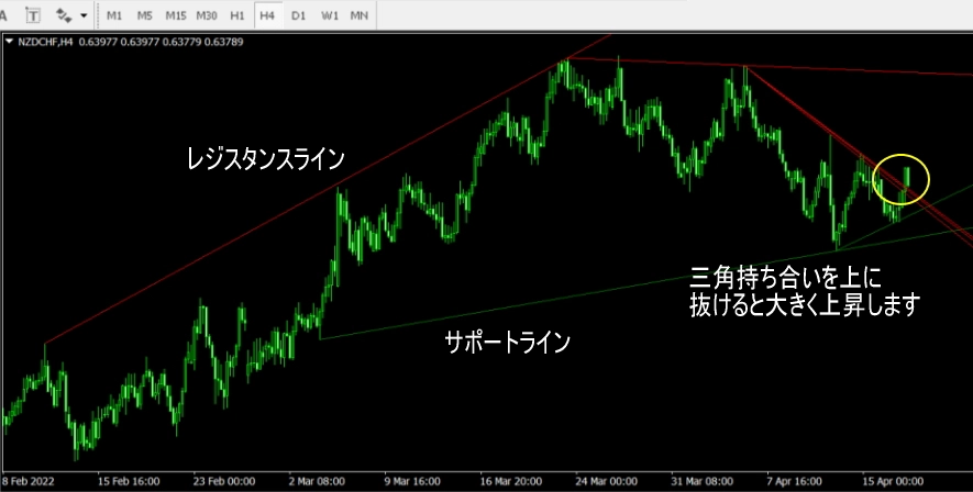 - 三角持ち合いのもみ合いの時、どちらかの方法に大きくブレイクするので、ブレイク方向を狙ってエントリーしていきます。大きなブレイクの場合は、初動に乗れると大きな利益を狙えます!
