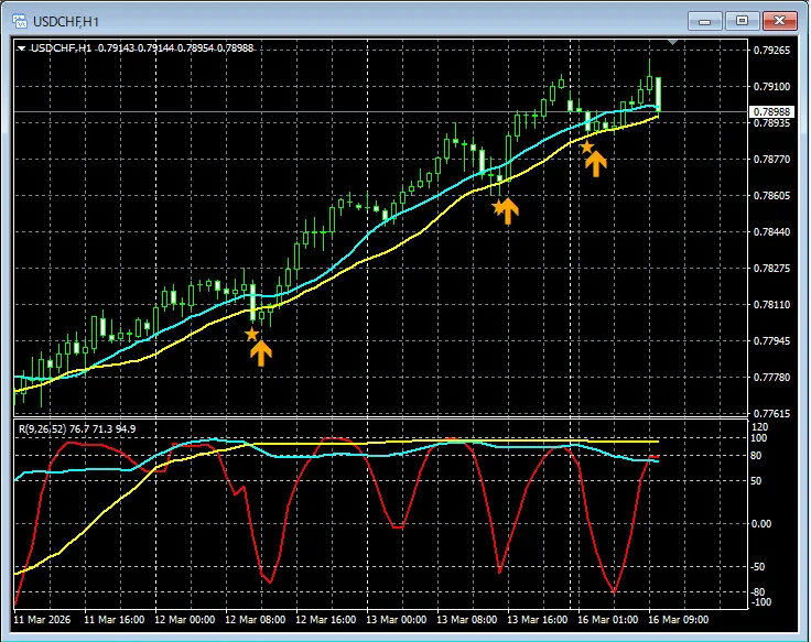 【RCIを極めて移動平均線フィルターで勝つ!!】ドルスイス 1時間足 mBDSRのサイン