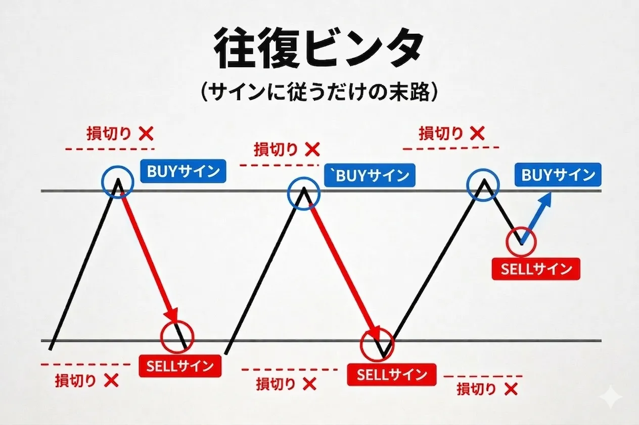 サインを使っていると、上向きのサインが出た瞬間にロングしたくなり、損切りにあう。その後もサインが上のままだとショートが選びにくくなり、流れが変わっていてもロング方向に思考が固定される。これはサインに従っているのではなく、サインに縛られている状態です。