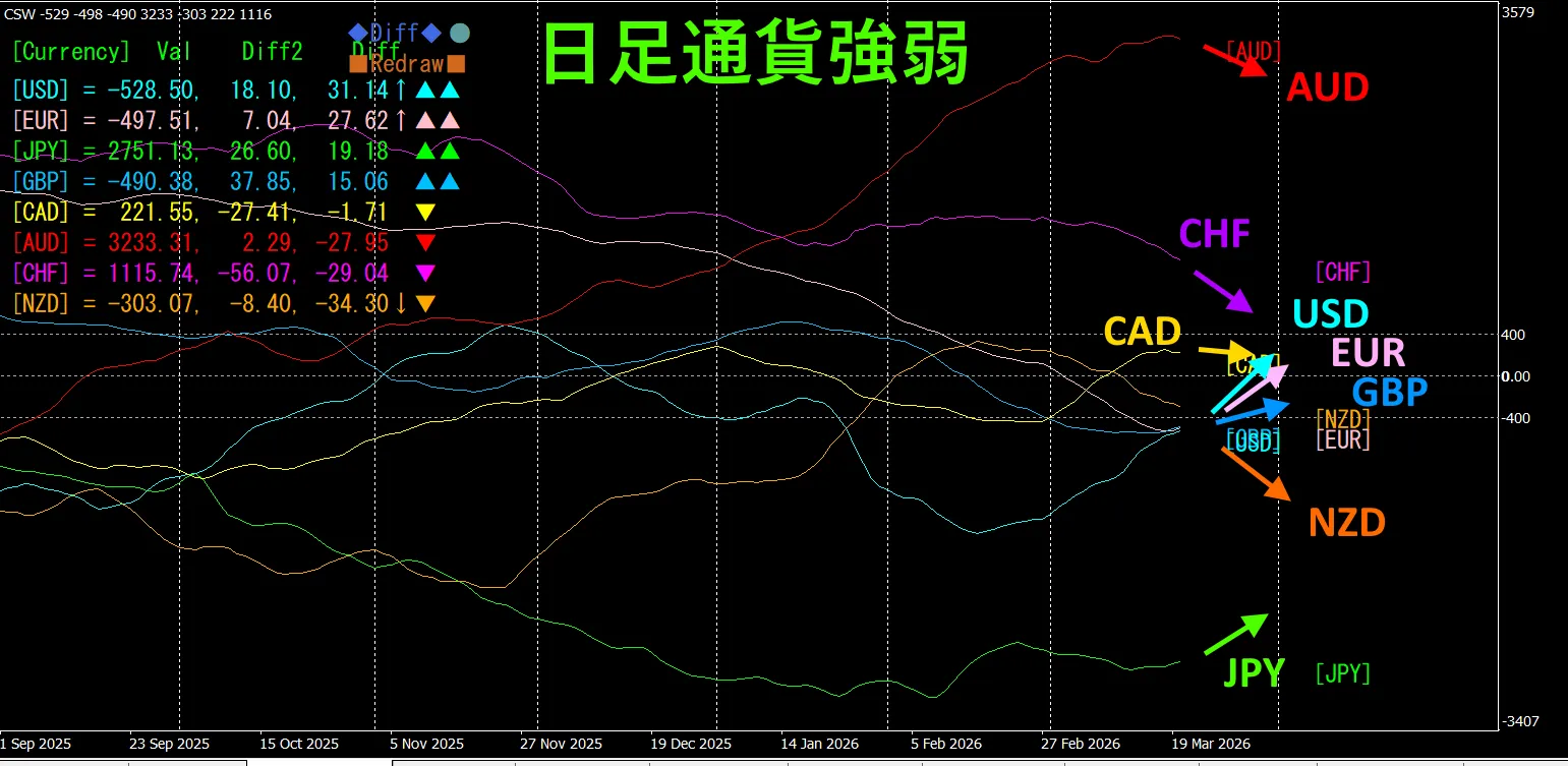 USD、EUR、JPY、GBPが上向きです。NZD、CHF、AND、CADが下向きになっています。日足では、USDの上昇と、NZDの下落が目立っています。AUDはやや弱まってきました。