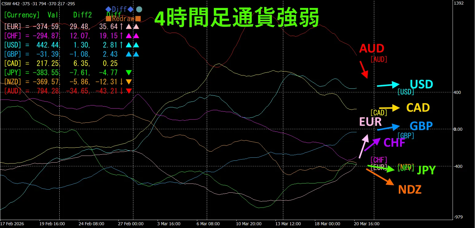 4時間足では、EUR、CHF、USD、GBPが上向きに、AUD、NZD、JPYが下向きに、CADはほぼ水平になっています。