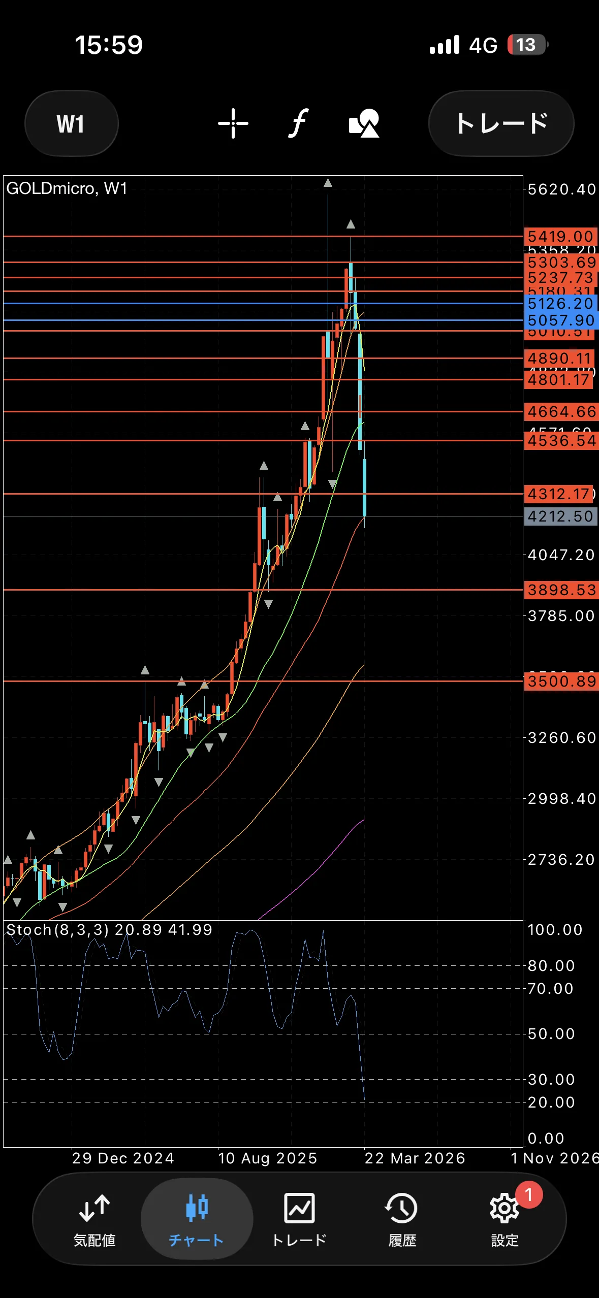 週足40SMAにタッチしている状態ですが、このMAが効くかどうかは止まった後の結果でしかわかりません。
