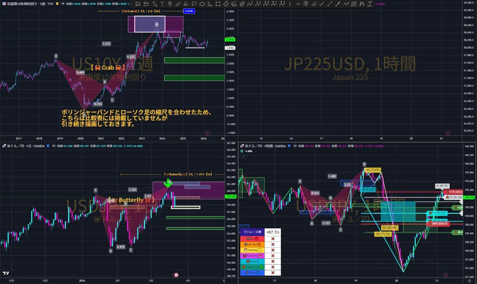 【PRZ】に到達しているHarmonic-Patternは、米国債10年利回り〖週足〗【Crab】⇩と、ドル円〖日足〗【Butterfly】⇩の2つ。共に下方向のHarmonic-Patternが示現しており、ハーモニックの観点からは変わらず下降目線で見ています。
