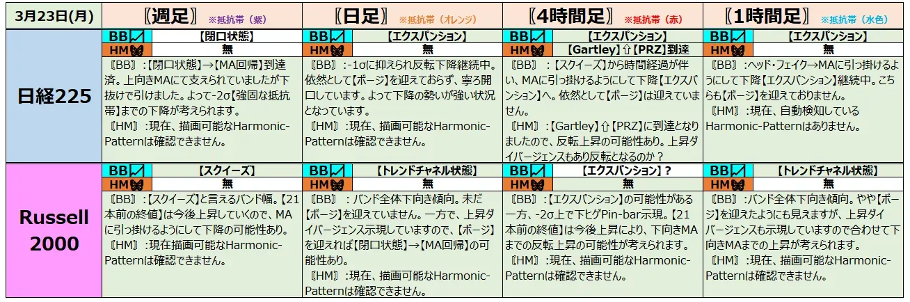 日経225・Russell2000ともにバンド開口継続により下降シナリオが優勢な局面です。
