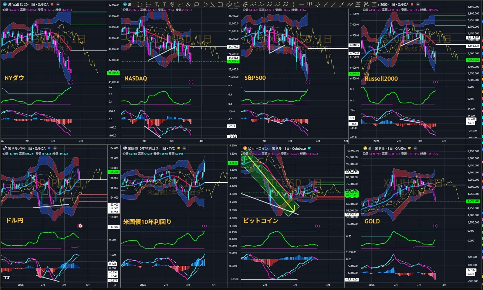 ボリンジャーバンドでは米主要4指数が【エクスパンション】・【トレンドチャネル状態】の下降トレンドを継続しており、ドル円・米国債10年利回りとの【逆相関】が続いています。