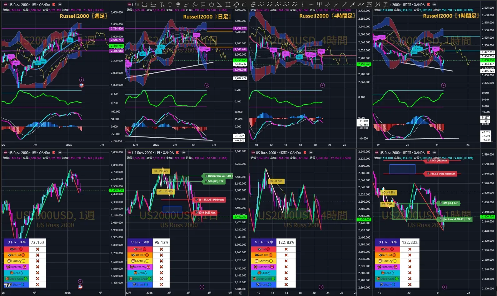 日経225の〖4時間足〗【Gartley】⇧【PRZ】やRussell2000の〖1時間足〗【ボージ】は短期的な反転の可能性を示唆していますが、上昇ダイバージェンスが示現していてもバンド開口が収縮しない限りは反転の根拠として過信しないことが重要です。