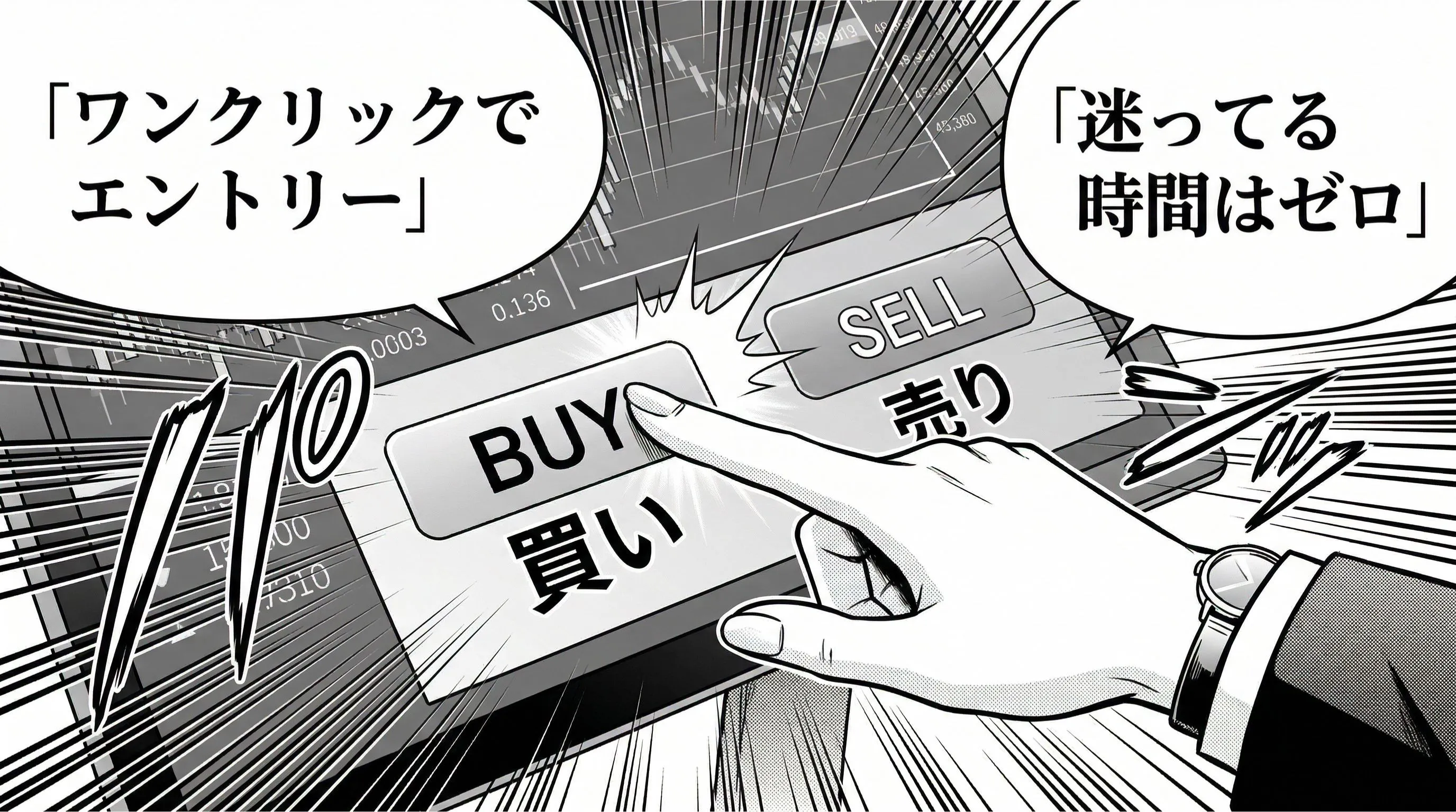 さらに、すべてのポジションを即座に整理できる「一括決済機能」を搭載している点も大きな特徴です。相場の急変時や重要指標発表時など、迅速なリスク回避が求められる局面において、ワンクリックで全ポジションをクローズできるため、判断から実行までのタイムラグを最小限に抑えることができます。複数ポジションを保有している場合でも、個別操作の手間を省き、効率的なポジション管理を実現します。