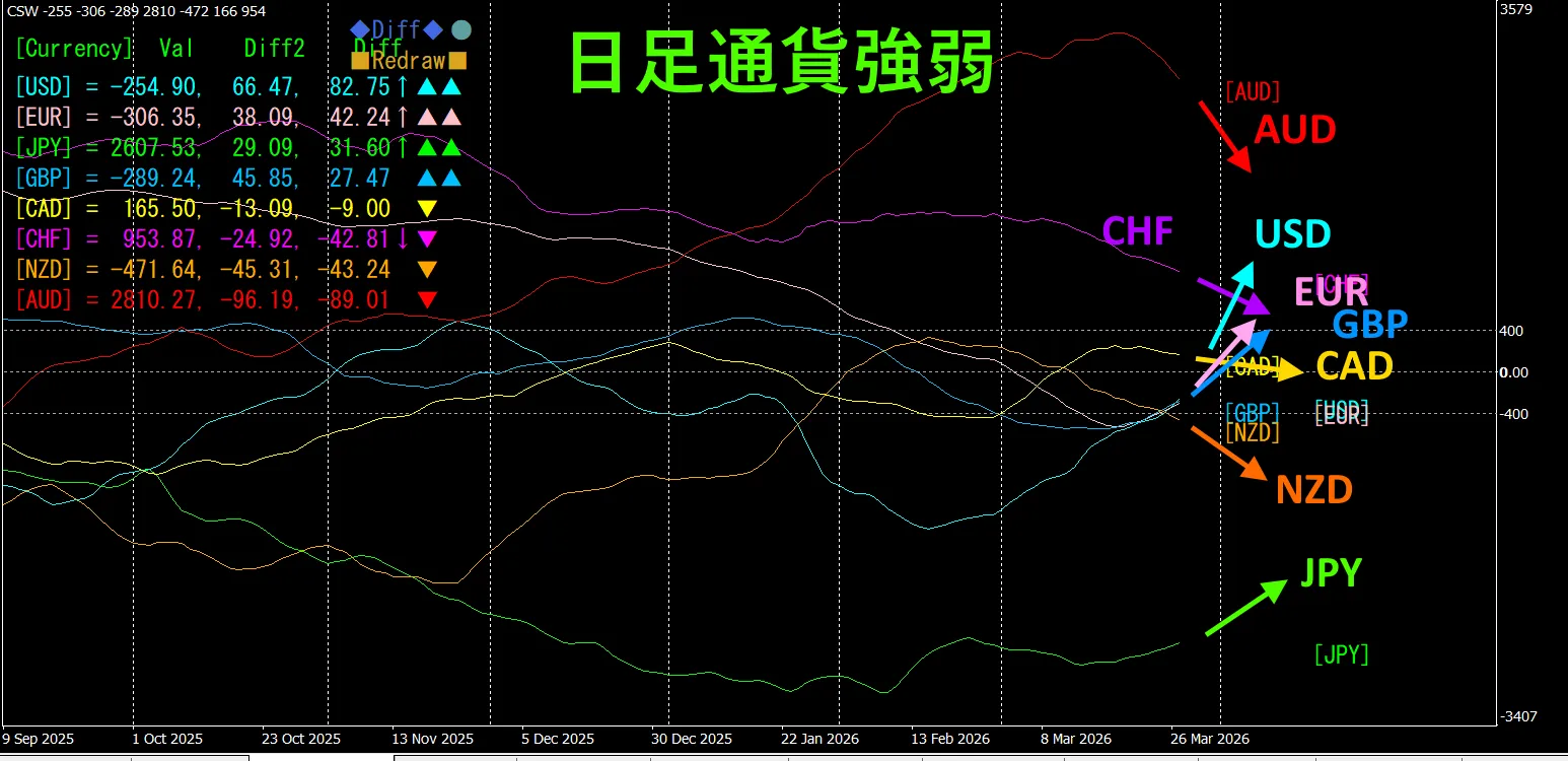 USD、EUR、JPY、GBPが上向きです。AUD、NZD、CHF、CADが下向きになっています。日足では、USDの上昇と、AUDの下落が目立っています。