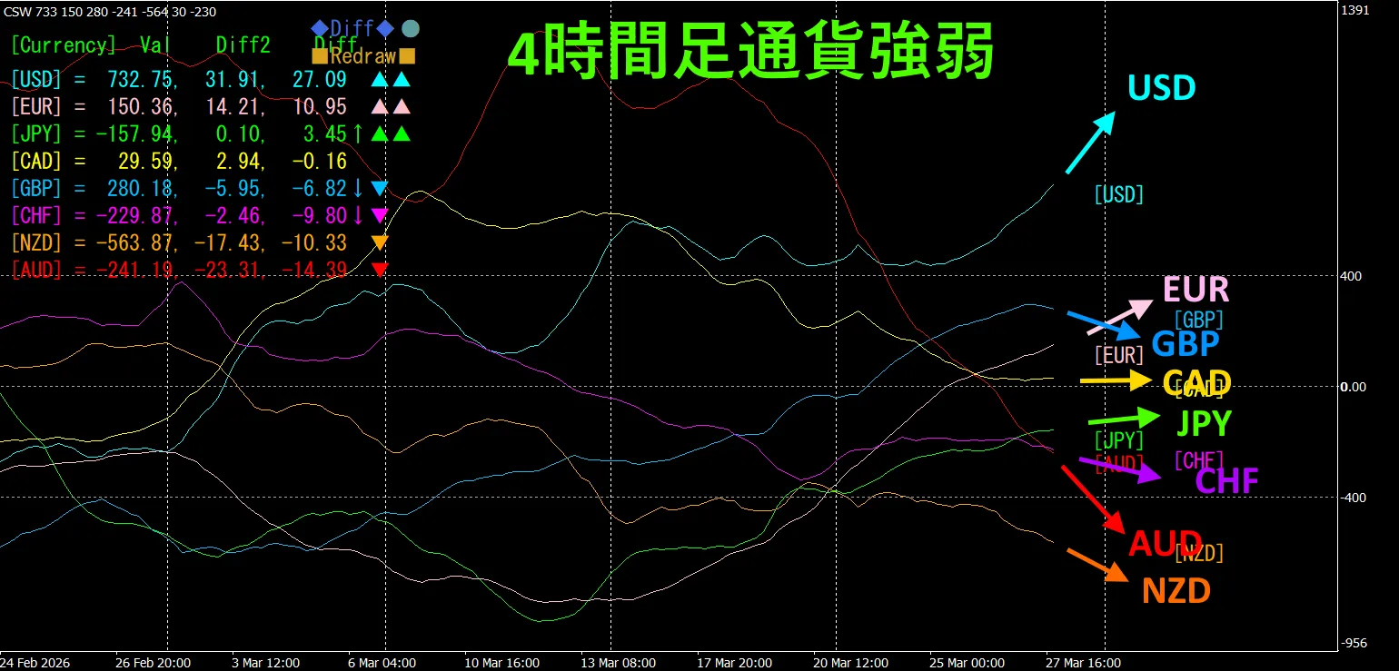 4時間足では、USD、EUR、JPYが上向きに、AUD、NZD、CHF、GBPが下向きに、CADはほぼ水平になっています。