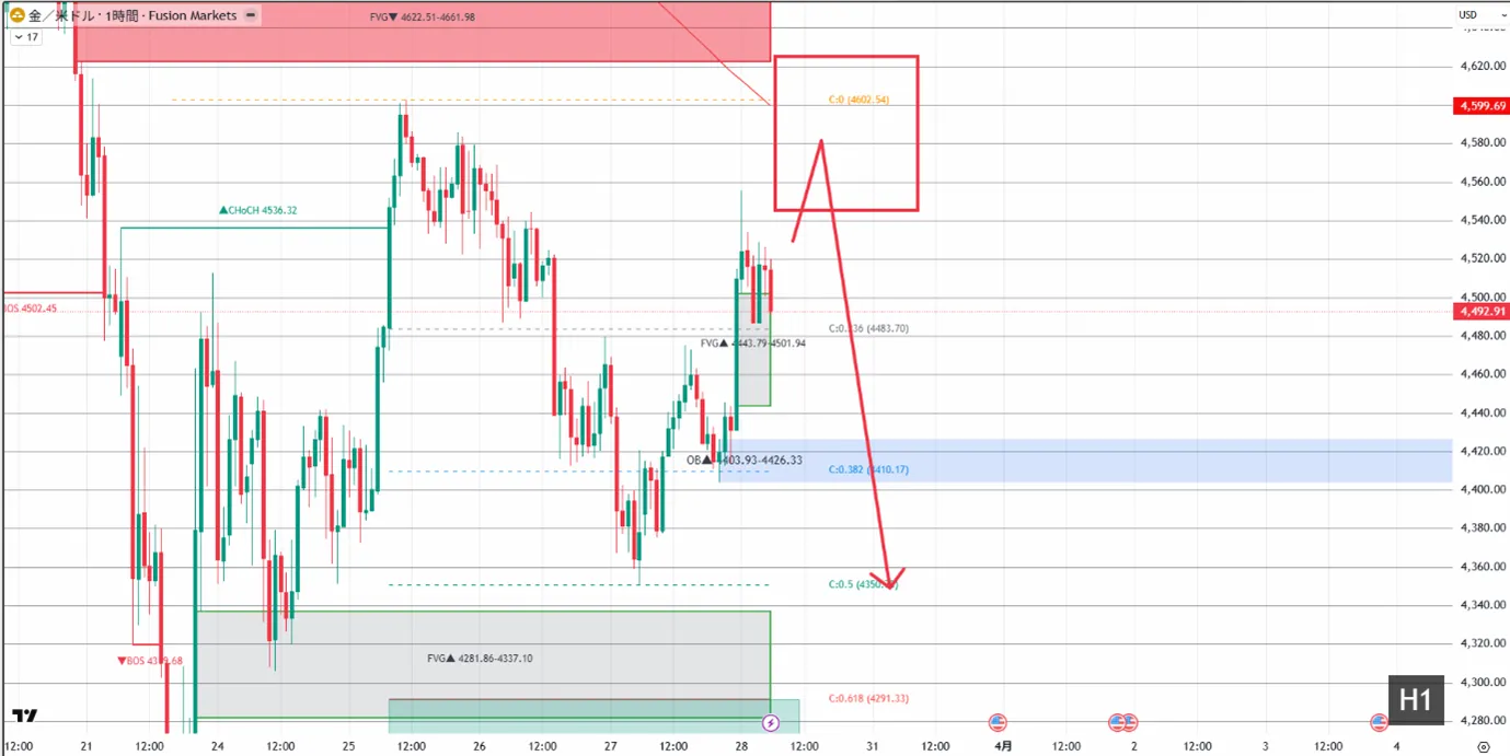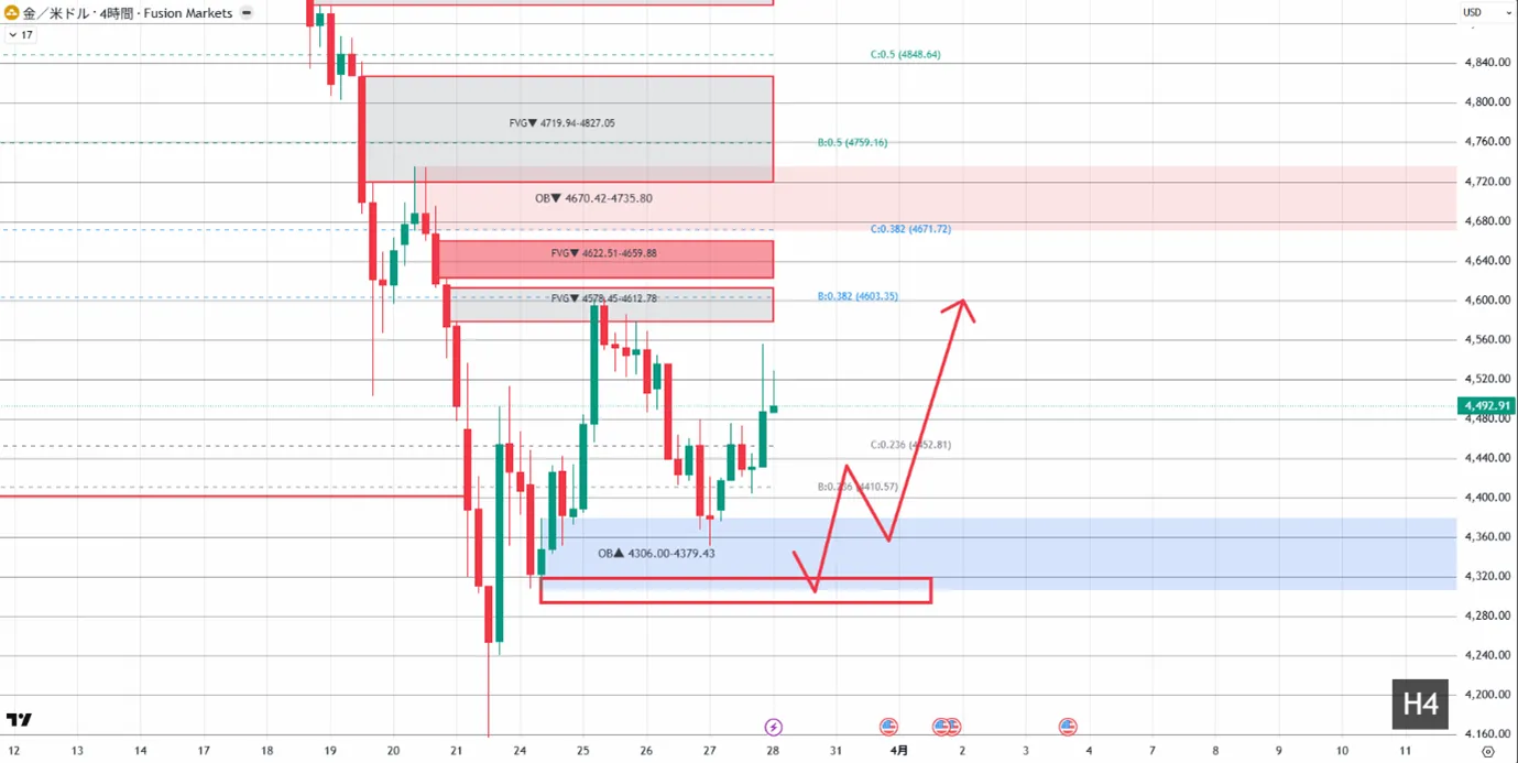 前提: 週高値を超え、H4の上抜けCHoCH(4,735)手前のH4レジスタンスOB帯(4,670〜4,735)に到達するケース。ここはH4 CHoCHゾーンそのものであり、来週で最も強いレジスタンス。すぐ上にはH4レジスタンスFVG(4,719〜4,827)も控えており、OBで止まらずFVGまでスイープしてから反転する可能性もある。今の相場はトランプ発言一つで1日5,000PIPS以上動くため、現在値から2,000PIPS前後離れていても到達の可能性は十分ある。