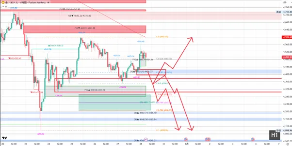 前提: 金曜高値(4,555)を含むM15レジスタンスOB帯に再接近するが、勢いが減衰しているケース。この帯にはM15レジスタンスOB(4,545〜4,569)とM15レジスタンスOB(4,583〜4,613)が上下に並んでおり、さらにH4レジスタンスFVG(4,578〜4,612)も重なる厚い抵抗帯。金曜はここで頭を抑えられて引けており、同じゾーンが再び機能する可能性がある。