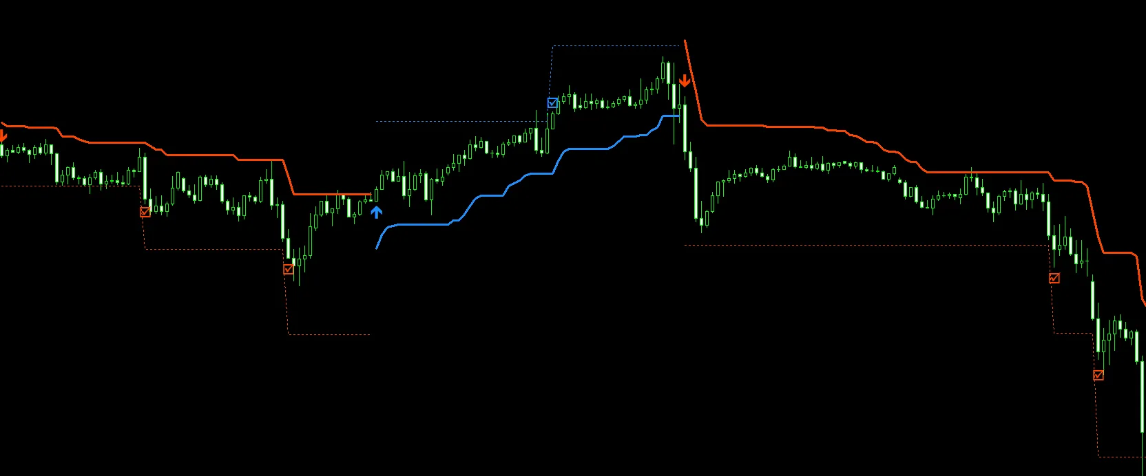 スーパートレンドはシンプルで使いやすいインジケーターです。トレンド方向を1本のラインで示し、転換のタイミングを矢印で教えてくれる。これだけでも十分に使える。