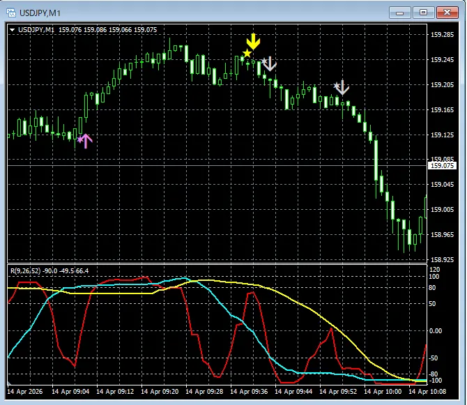mBDSR(RCI2本フィルター)のサインとR1R2S2のサインの両方を活用する(114) ドル円 USDJPY 1分足(本日のチャートから)