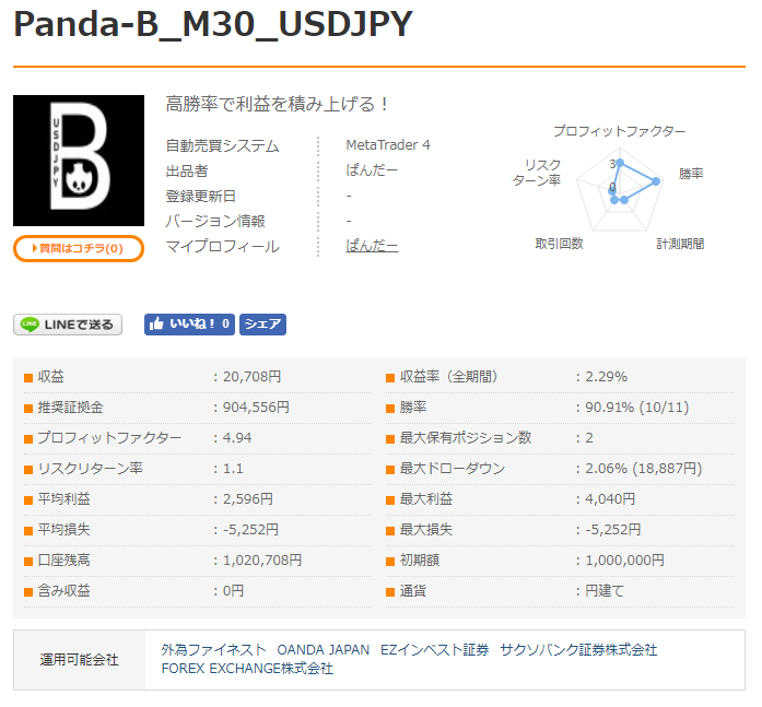 高勝率と早い利確で取引回数に頼らないスキャルピングEA『Panda-B_M30_USDJPY』