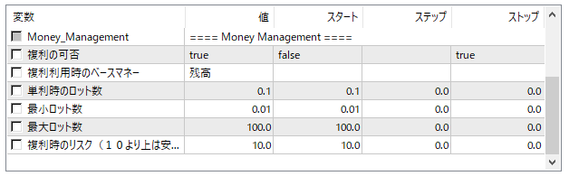ドローダウンも大きくなっているので注意は必要ですが、取引回数が多くなく高勝率であるこのEAでは複利での運用が収益効率が良くなりそうです。今回はデフォルト設定ですが、ロットのリスク管理もEA設定から可能です。