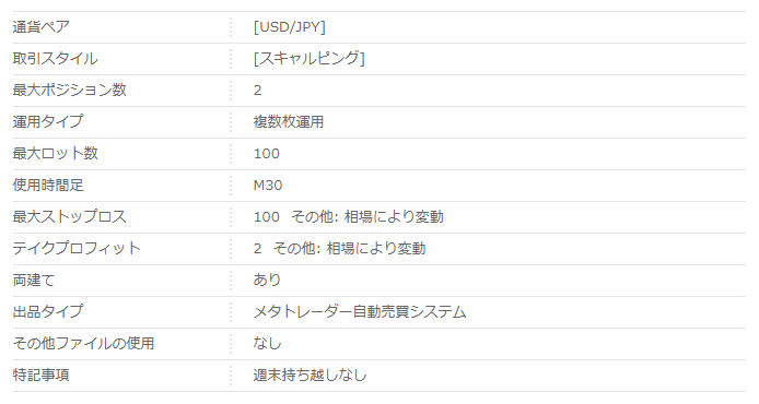 使用時間足がスキャルピングにしては比較的上位時間軸の30分足で、ストップロス100(相場で変動)に対し、テイクプロフィットが2と設定(相場で変動)されているのが特徴的です。