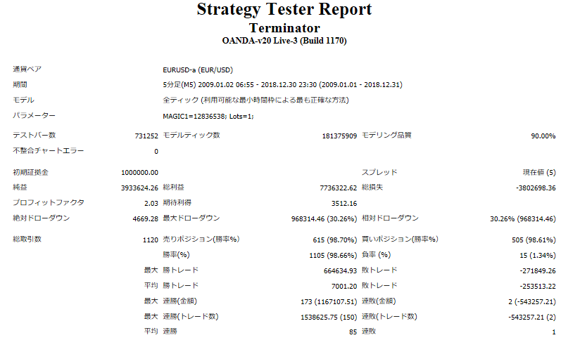 勝率はほぼ負けなし、プロフィットファクターも2.03と優秀なEAです。