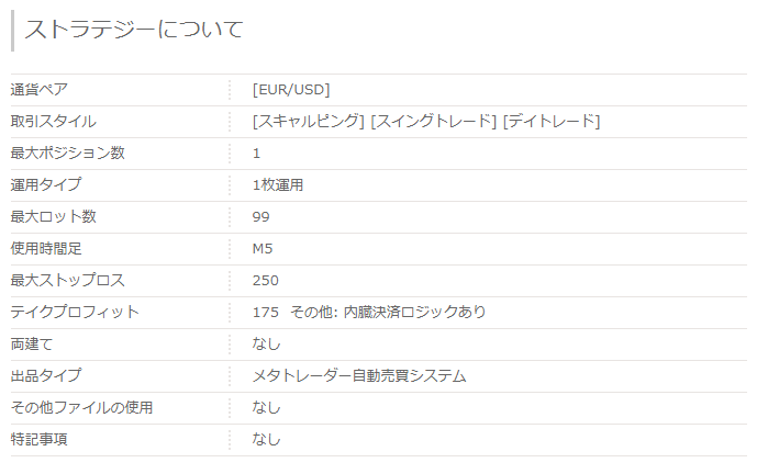 取引スタイルは短期~長期、1ポジションでトレードを行っていくようです。商品ページによるとナンピン、マーチン、両建てはしないとのことです。