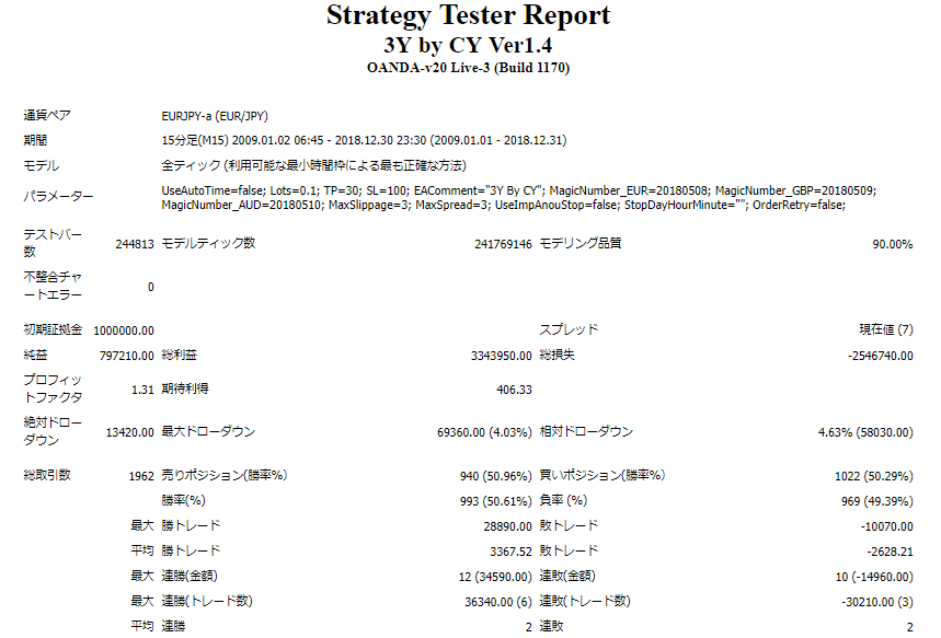 今回はlot数を0.1に設定してバックテストを行いましたが、調整すると結果が変わってきそうです。