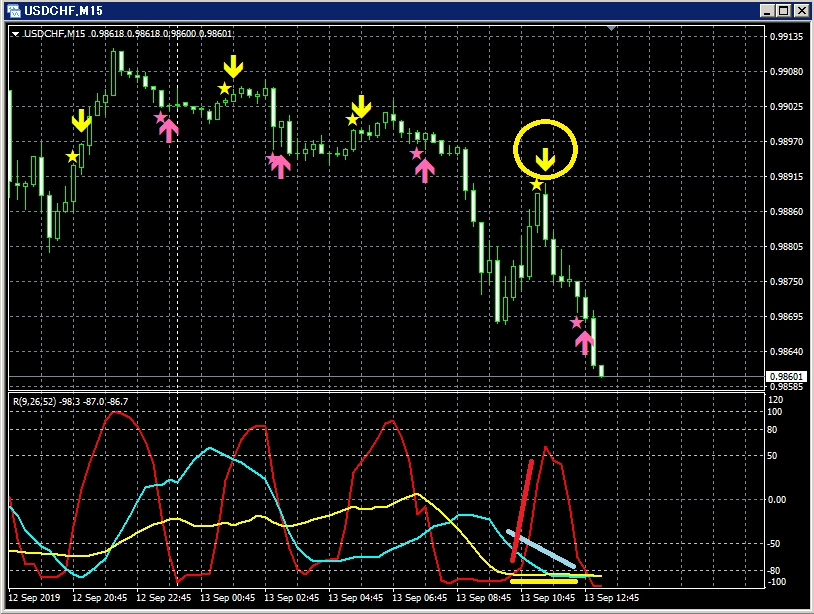 「RCI3本ライン+mBDSR」の戻り売りサイン点灯からの下げ。