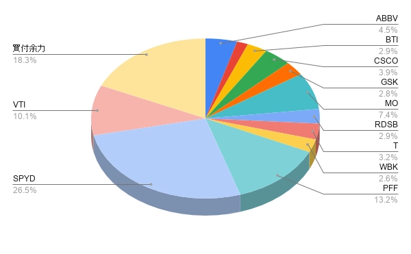 従前からの保有銘柄では、ABBV(+6.8%)、T(+5.5%)が好調。一方、MO(‐3.7%)、CSCO(+0.2%)が不調でした。