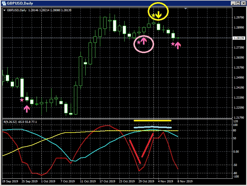 下図は、今週(11月11日~11月15日)見られた「RCI3本ライン+mBDSR」のサインの例です。
