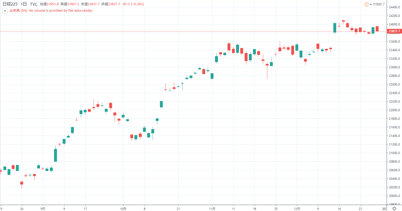 日経平均株価は前日比142円05銭高の23924円92銭と反発し、TOPIXも9.78ポイント高の1731.20と7日ぶりに反発した。出来高は8億2186万株だった。前日の米国市場がクリスマスで休場となり、手掛かり材料が薄い中、日経平均は前日終値付近で寄り付いた。その後、先週からのじり安基調で日本株に割安感が出ていたことで、先物主導で買いが入り上昇した。また、この日は12月の権利取り最終売買日だったことも買いを誘った可能性がある。後場に入ると値動きが弱まり、23900円前後の高値圏で推移した。材料難の中で上海株が底堅かったことは、数少ない日本株の支援材料となった。為替相場が一日を通してやや円安に振れたことも半導体関連など景気敏感株の買いを強めた。海外投資家が少なく、売買代金は1兆円台前半と低調だった。個人投資家はこれまで売却を進めており、投資余力があることから、好業績など個別材料のある銘柄が買われる動きが目立っている。