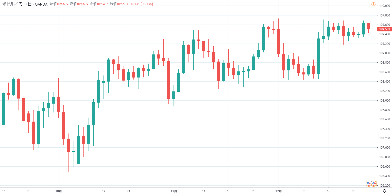 ドル円はロングを維持します。あと少しで高値更新となり、大きく上向く可能性がありそうです。5日移動平均線と288日線が絡み合ううごきから上放れしてきました。年末年始に急変する可能性がありますが、注意は必要ですが、その動きを先読みすることはできません。粛々とトレンドを追いかけるのが賢明な対処でしょう。109.70円を明確に超えてくると、ドル円は全く違う動きになりそうです。つまり、大幅な円安です。いまは市場でもそのような見方は全く聞かれません。依然として円高リスクを取り上げる市場関係者が大半です。しかし、日本の機関投資家の投資フローなどを考慮すれば、意外感のある円安となる可能性もありそうです。このように、来年は大幅な円安になる可能性も視野に入れておきたいと考えています。120円を目指す動きになる可能性もありそうです。