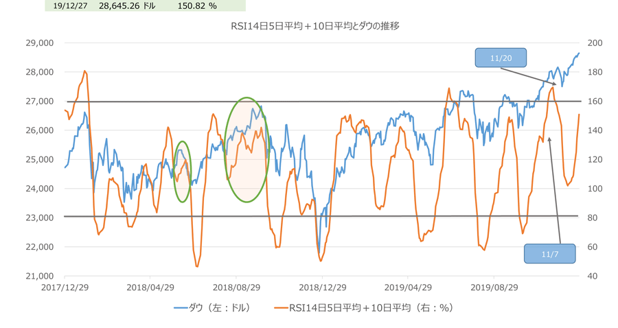 このことが示唆することは、この水準に達する前に、一度やや大きめな下げが起き、1/7を待たずに指数は一旦の高値を形成する可能性が高いということである。そのため、“リンク”を前提としている以上、本日の大納会で現在日経平均は下げているが、ここは触りたくない。「株(指数)を枕にお正月」は、本日はお勧めできないというのが心境だ。