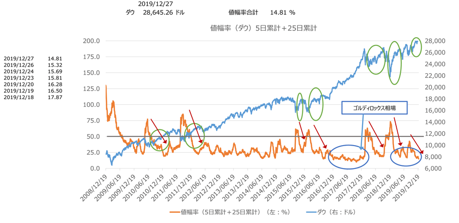 そして、最後の「値幅率」であるが、ダウの日中の高値から安値を引いて値幅を出し、それを前日の終値で割った「値幅率」と私が呼んでいる数値の、5日移動平均と25日移動平均を足した(つまり直近5日を倍にカウントした)数値は、14.81%にまで低下している。