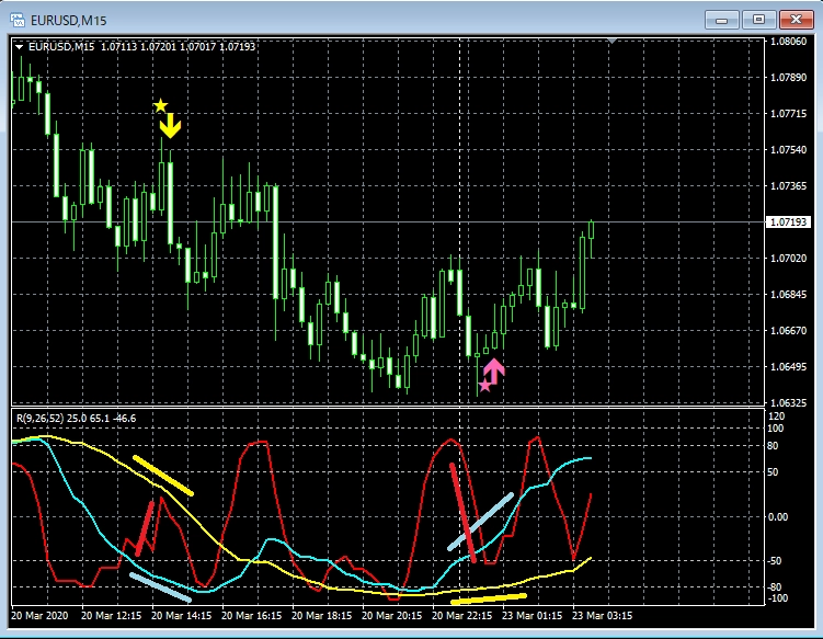 下図は、今週(3月16日~3月20日)見られた「mBDSRのRCI2本フィルターバージョン」のサインの例です。