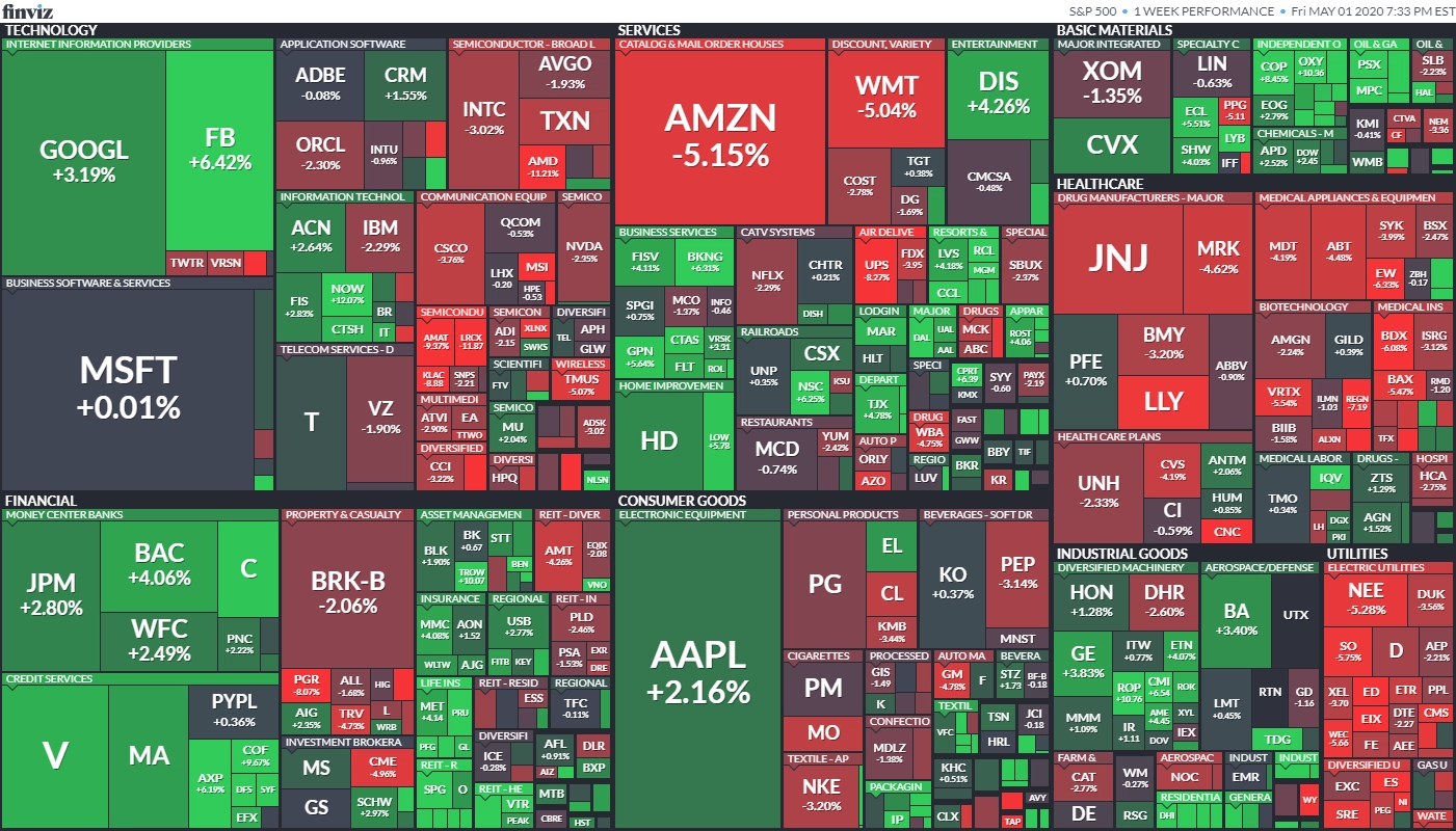 ヘルスケアセクター以外は、前週末比マイナスと言えるでしょう。個人的には、生活必需品セクターに注目しています。(出典:FINVIZ)