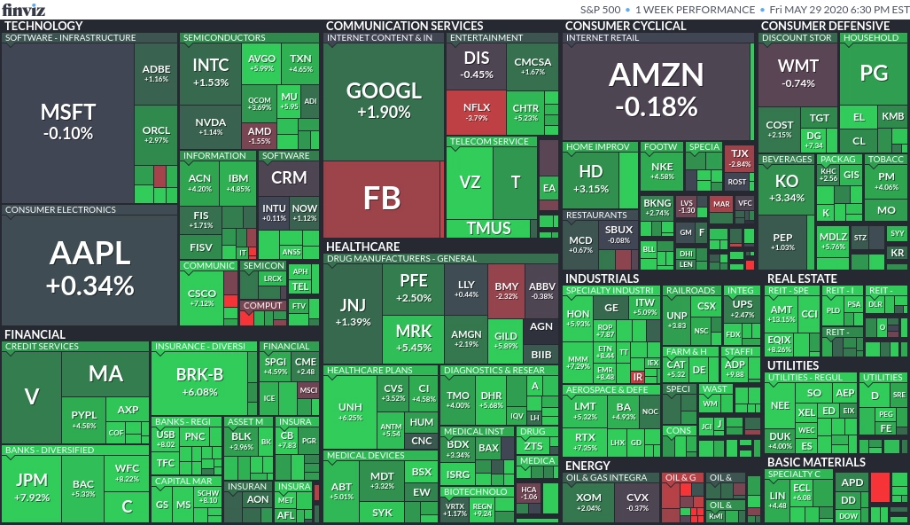 金融やエネルギー、資本材セクターが今週は上昇。(出典:FINVIZ)