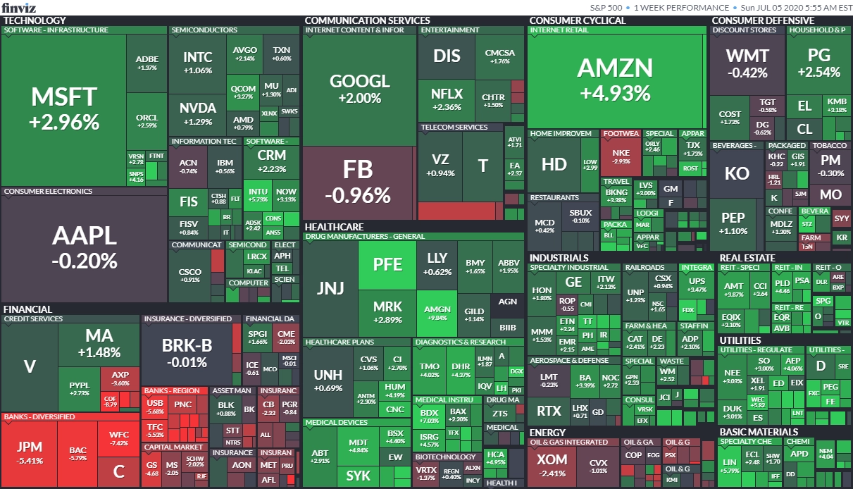 一般消費財や資本財、素材セクターが、今週は好調だった。一方、不動産や公益セクターは下落。(出典:FINVIZ)