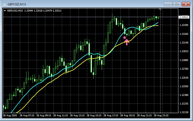 そして、あるローソク足の終値レベルで空色の星印の点灯が確定すると、その次のローソク足の寄り付きと同時に空色の上向き矢印が点灯します。