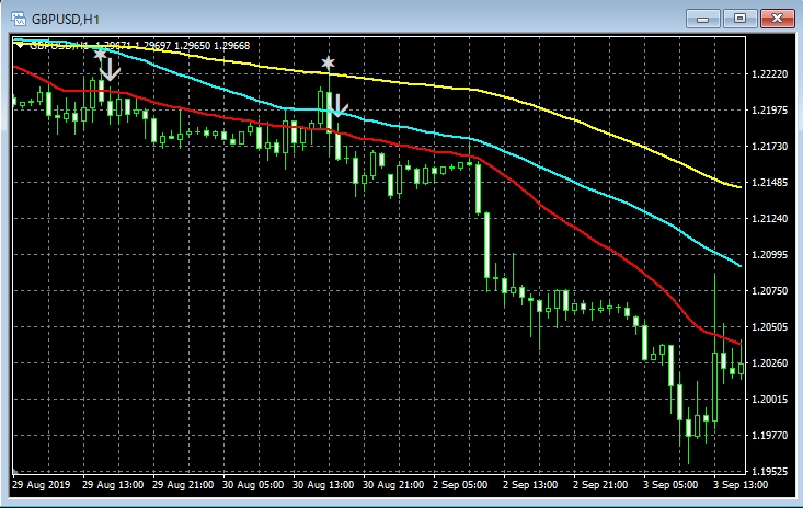 「任意の3本の移動平均線(短期線,中期線,長期線)の中で、短期線が反転したタイミングで3本の移動平均線の方向がそろったら知らせてくれるMT4インジケーター」