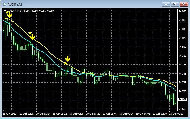 下のチャートは上の2つのインジケーターを表示した例です。
