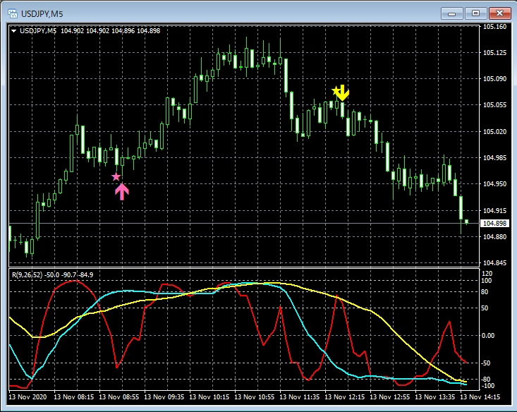 この矢印インジケーターのコンセプトは、「中長期の流れは2本のRCIで判断し、短期的な流れはモメンタムで判断しエントリータイミングをはかる」というものです。