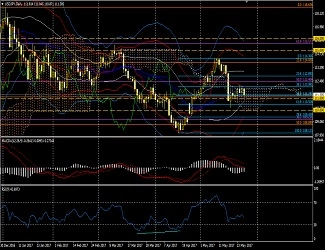 今週のロウソク足は弱い形。遅行スパンが陰転。雲の先端は陽転中。現時点では月足から30分足までは遅行スパン陰転中、雲の先端は陽転中となっている。要するに方向感がない。それが週足のボリンジャーバンドに現れている。週足では今月は雲が薄い期間に差し掛かる。三役逆転が起きやすい状況である。以前から指摘している拡大トライアングル(ピンク色の波動)は第5波動形成中に思える。目標値はオレンジ色フィボナッチリトレースメント61.8%。現在、110円近くまで来ているが110円を割るかどうか。