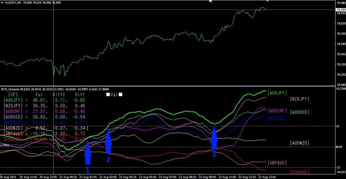 図は、上半分がEURAUDの5分足チャート、下半分が、「8CP見える化インジケータ」です。