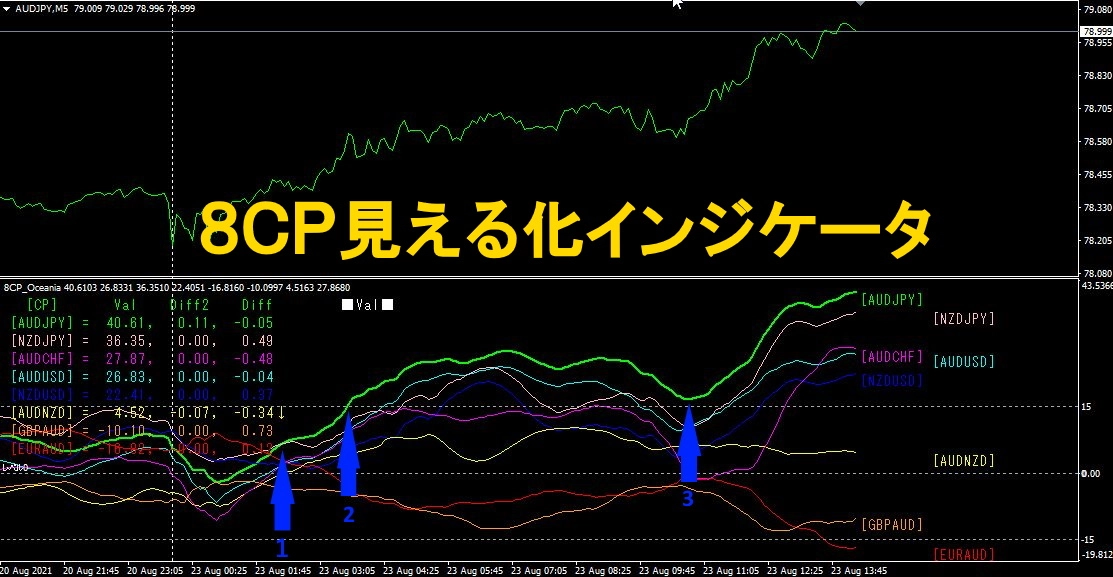 上半分が、NGAS-OCT21の1時間足チャート、下半分が「8CFD見える化インジケータ」です。