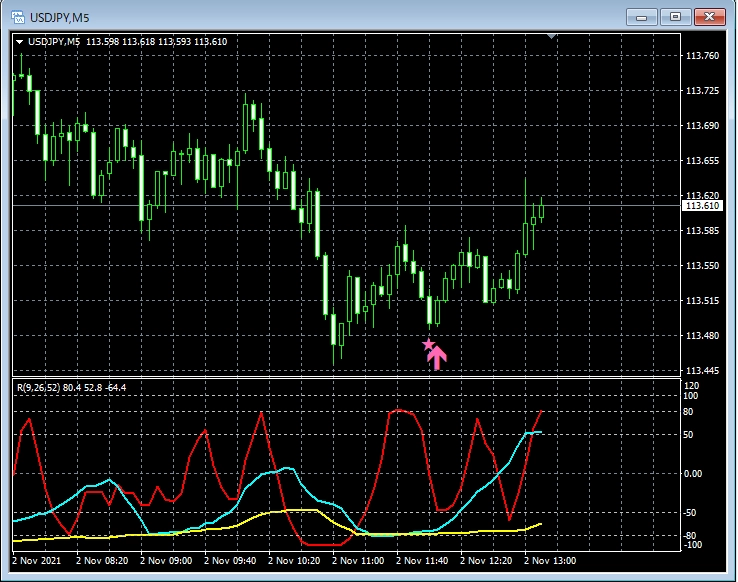 1時間足を見てみると、RCI3本ラインのうちRCI9のみが明確に下げている場面がありました。