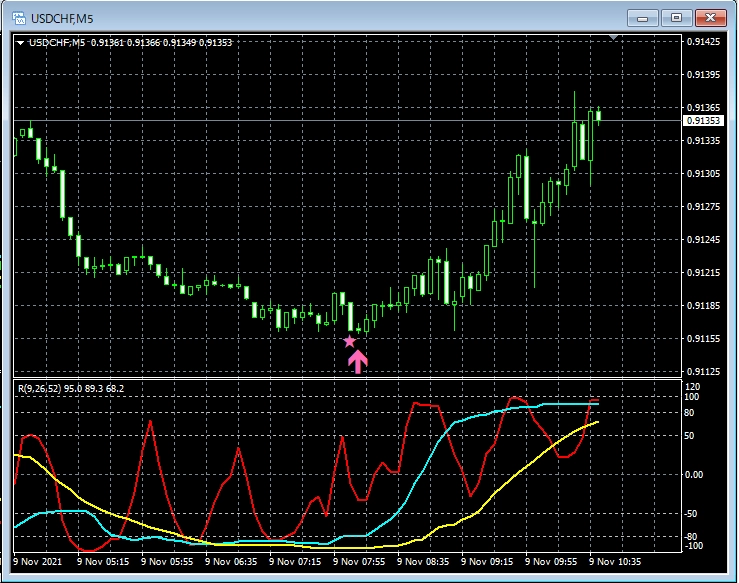 4時間足短期RCI(RCI9)底値圏からの上昇対応例