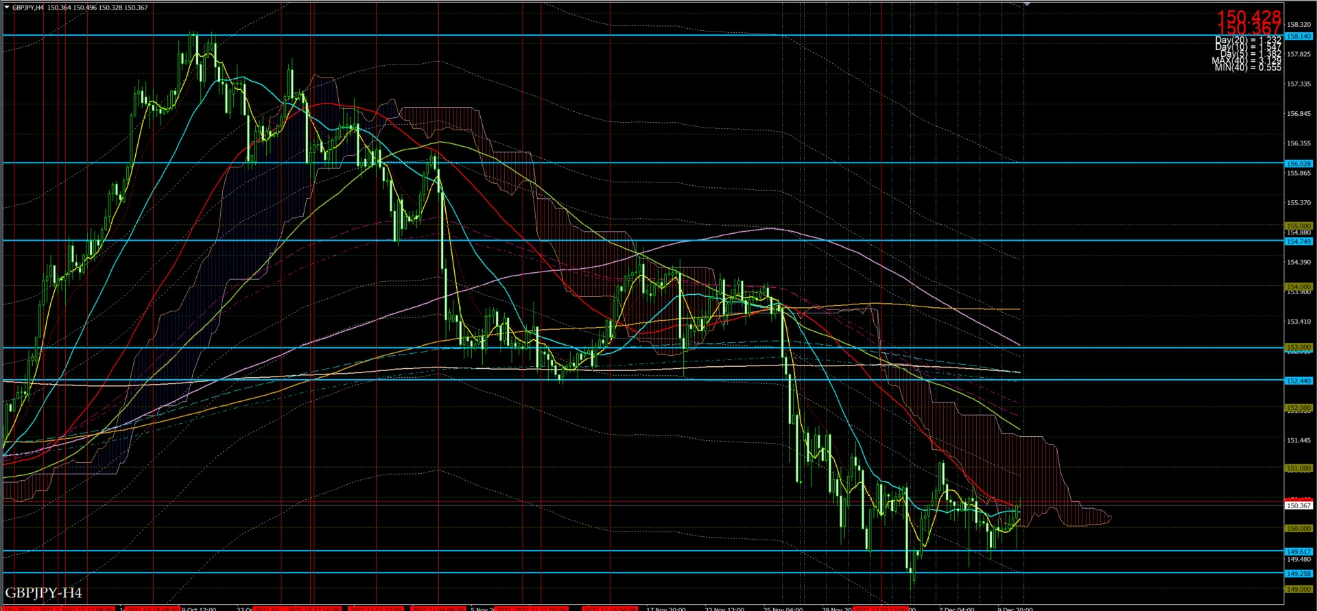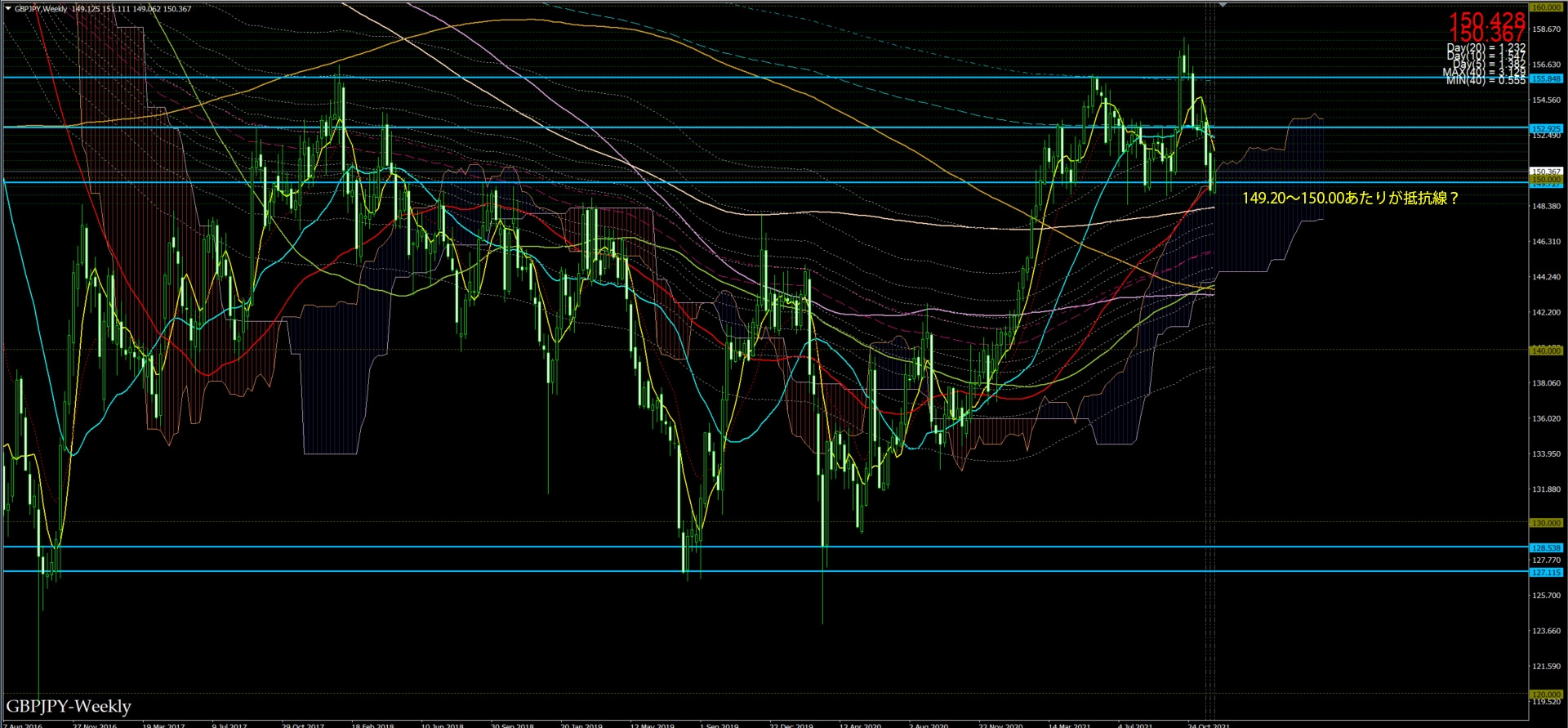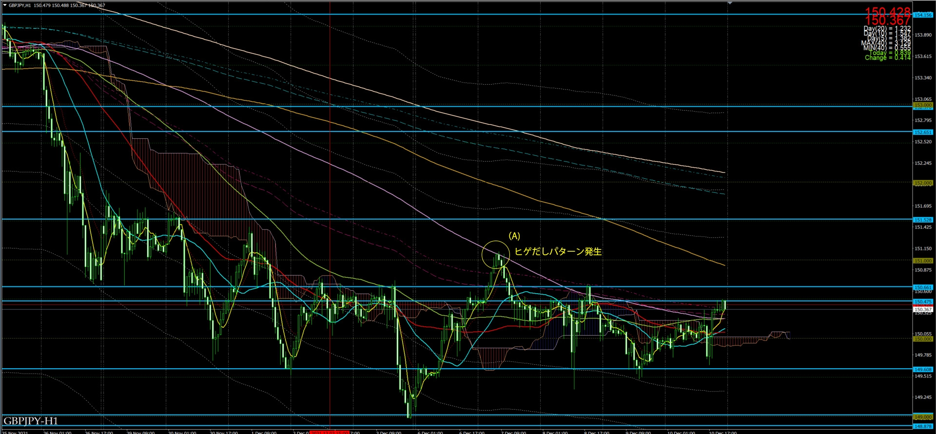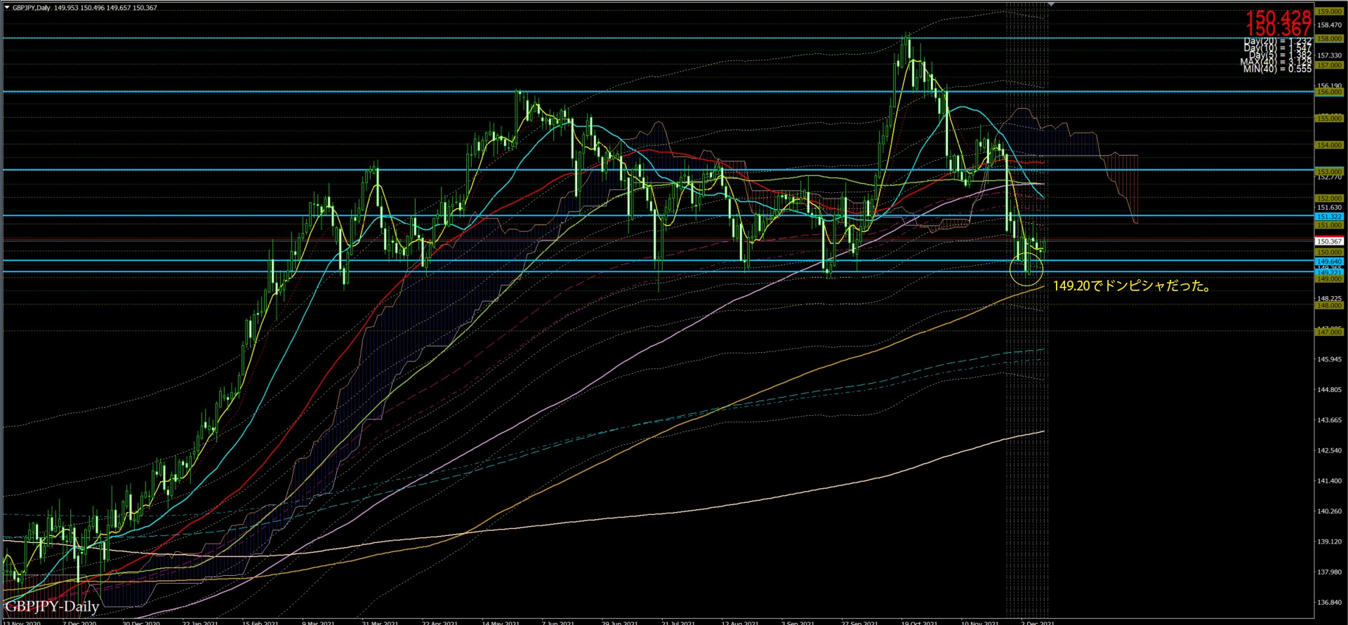 日足をみると、先週末の日足が149.20あたりでドンピシャとなっていた。
