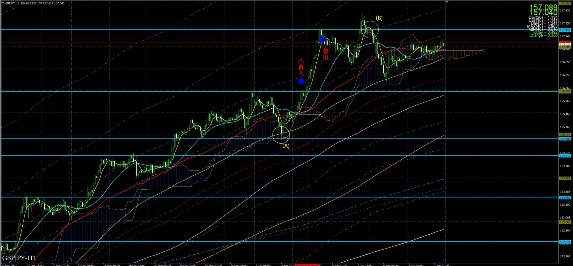(A)はMA100のヒゲだしパターンだった。しかも156.00の「00」へのドンピシャでもあった。正月明けで相場が薄いのではと思い入れなかった。