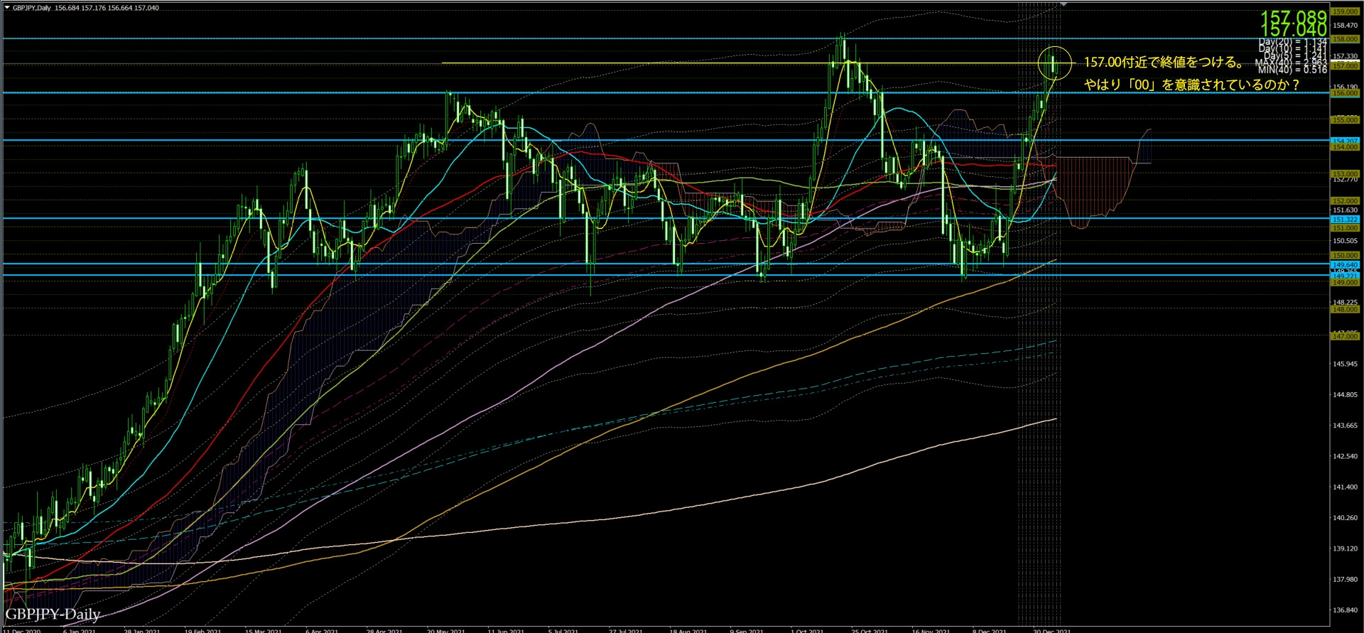 日足をみると、週末の終値が157.00あたりで終わっている。「00」が抵抗線となっているのか?